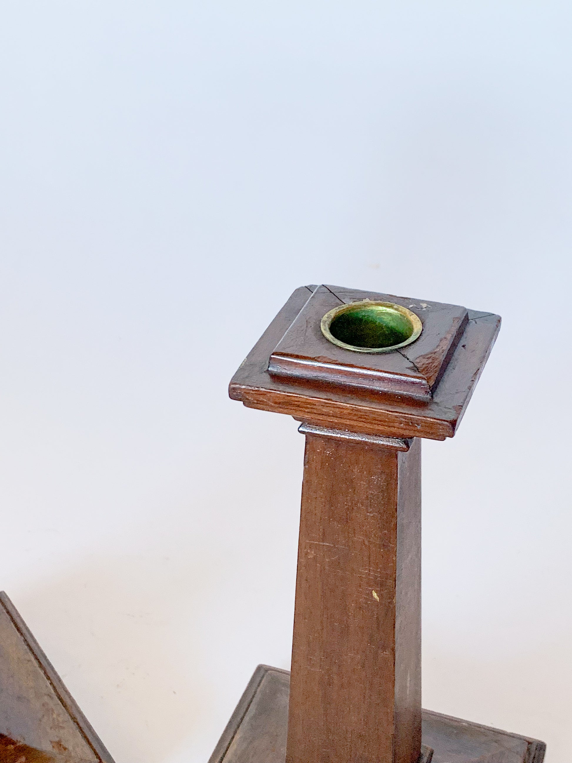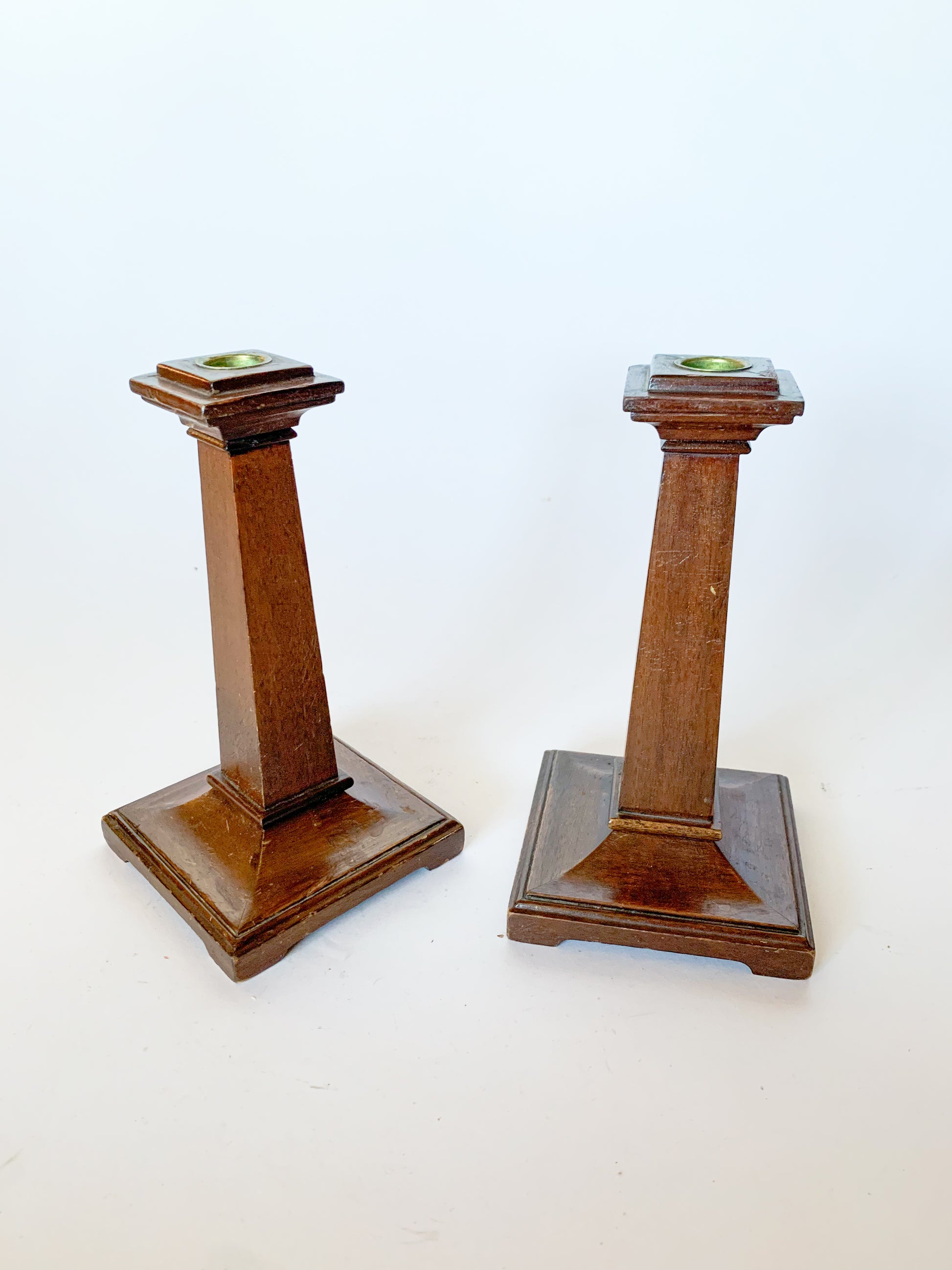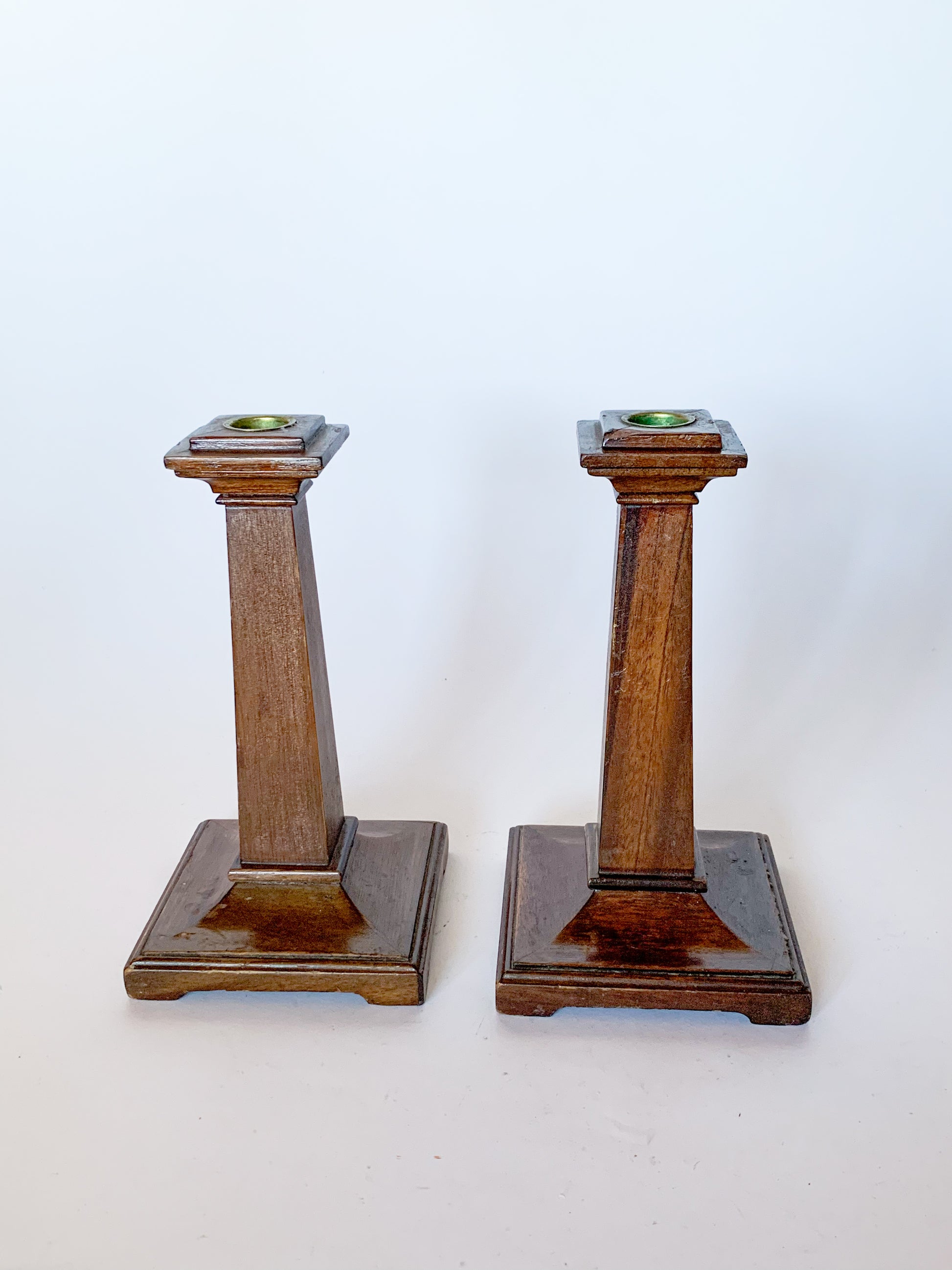 Beautiful pair of vintage Squared Georgian style wood candlestick holders. This unusual shape in a wooden taper candle holder is so modern and elegant. It has the look of a column or pillar. It is not signed or dated, but appears to be from the early 20th century.