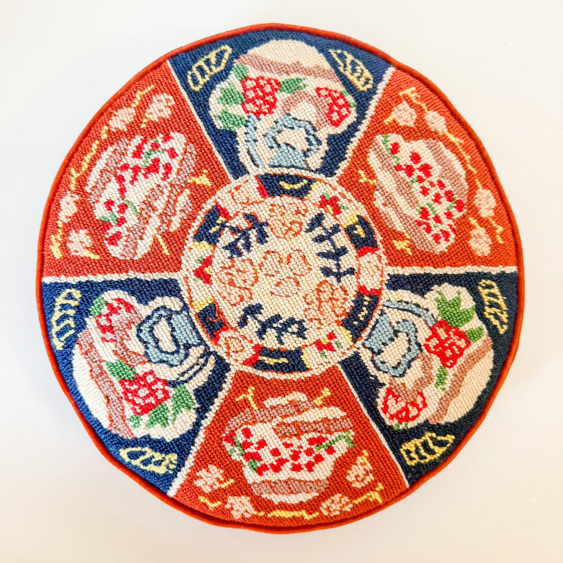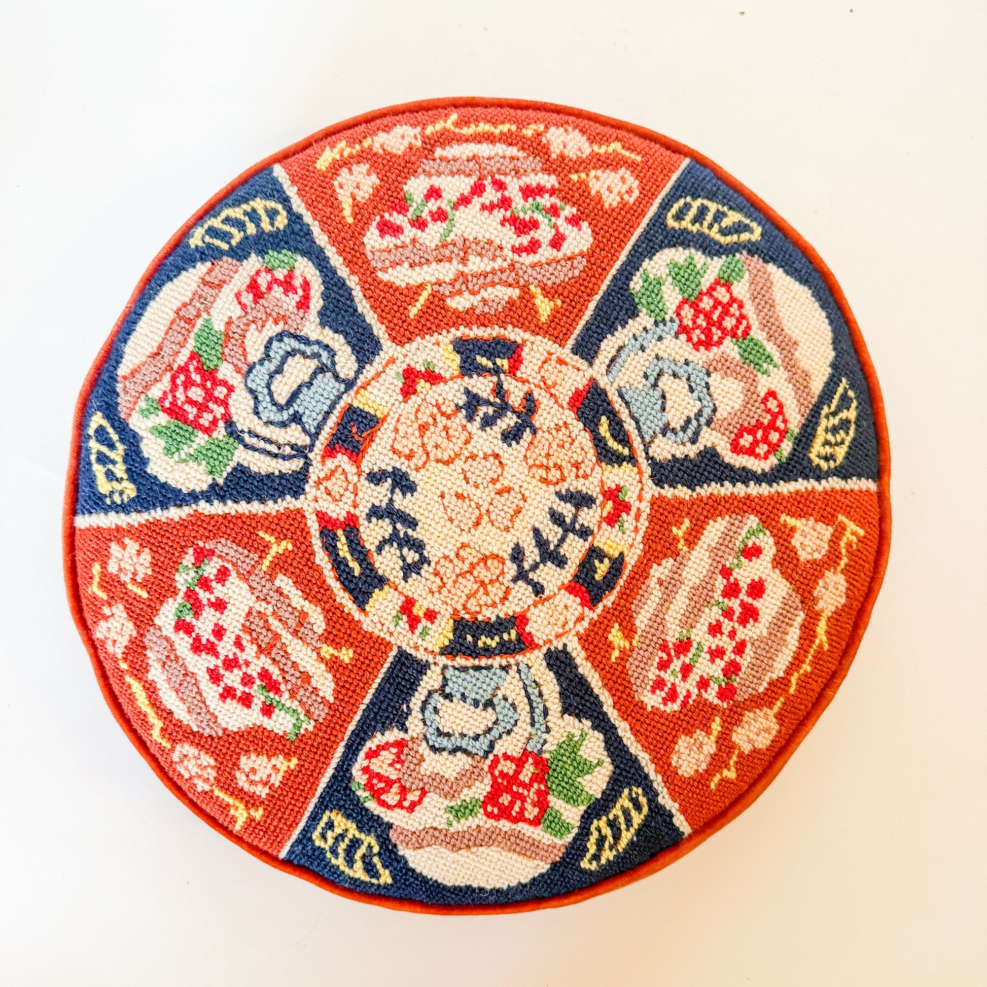 Absolutely fantastic vintage handmade Imari needlepoint pillow with rich rust red colored velvet welt and back. With amazing colors true to an Japanese Imari porcelain plate (rust, navy, blush pint, sky blue, grass green, yellow) this pillow is so eye catching. The velvet is in excellent condition.