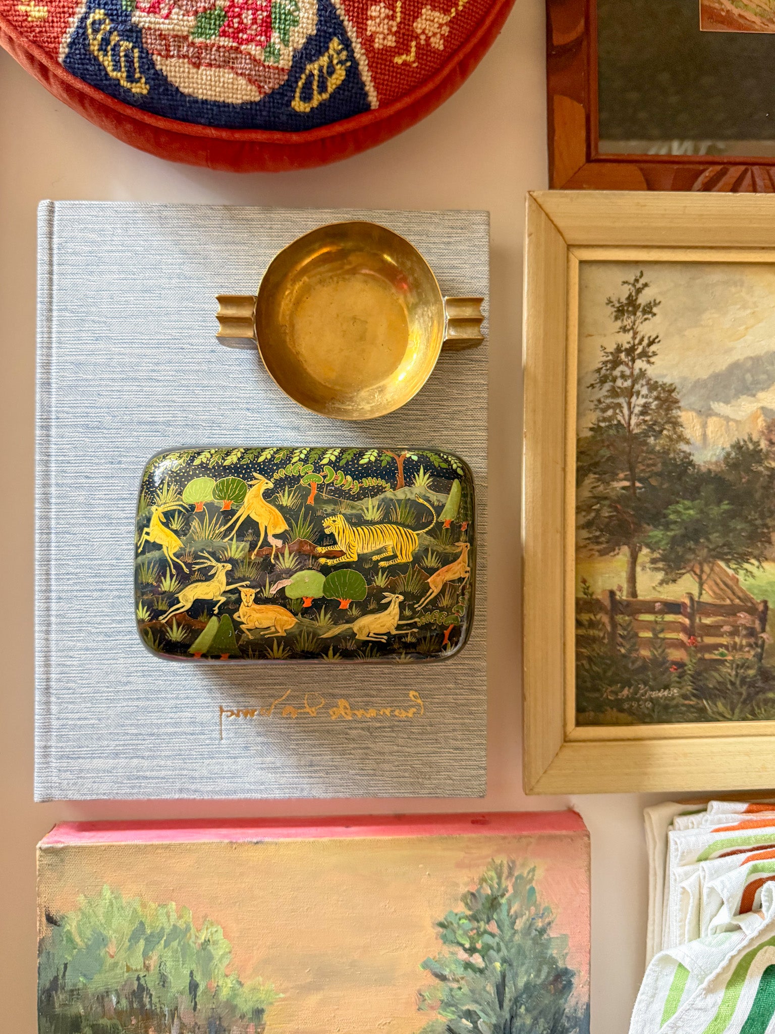 A lovely pale blue linen cover with gold imprinted spine label and pristine original dust jacket. Coffee table books are a great layering tool for your home, to add color, texture, and a collected feel. Stack them with an object, vase, or box on top. This stunning vintage art book is from the "Library of Great Painters" collection, by the well-known publisher, Harry N. Abrams.