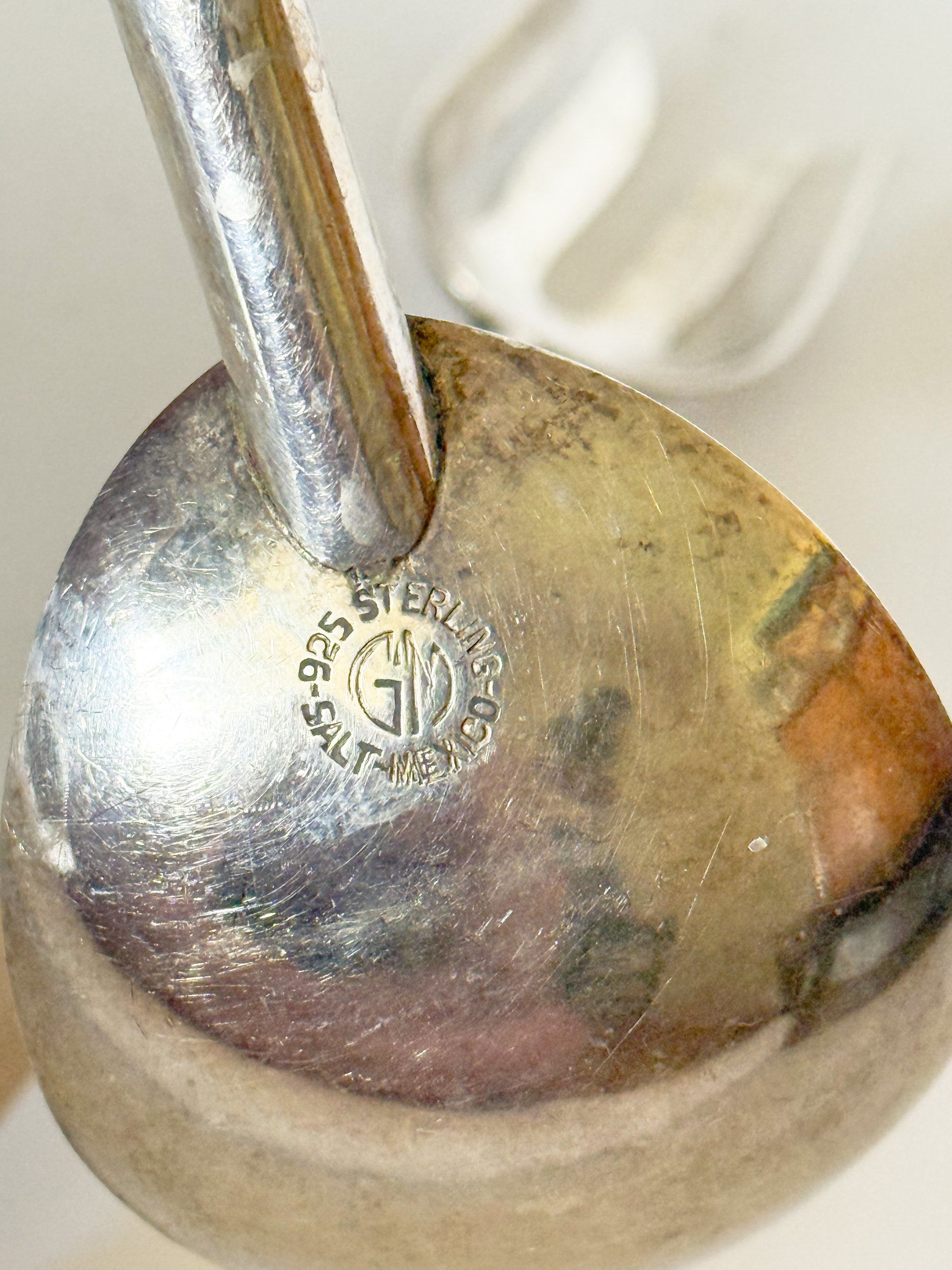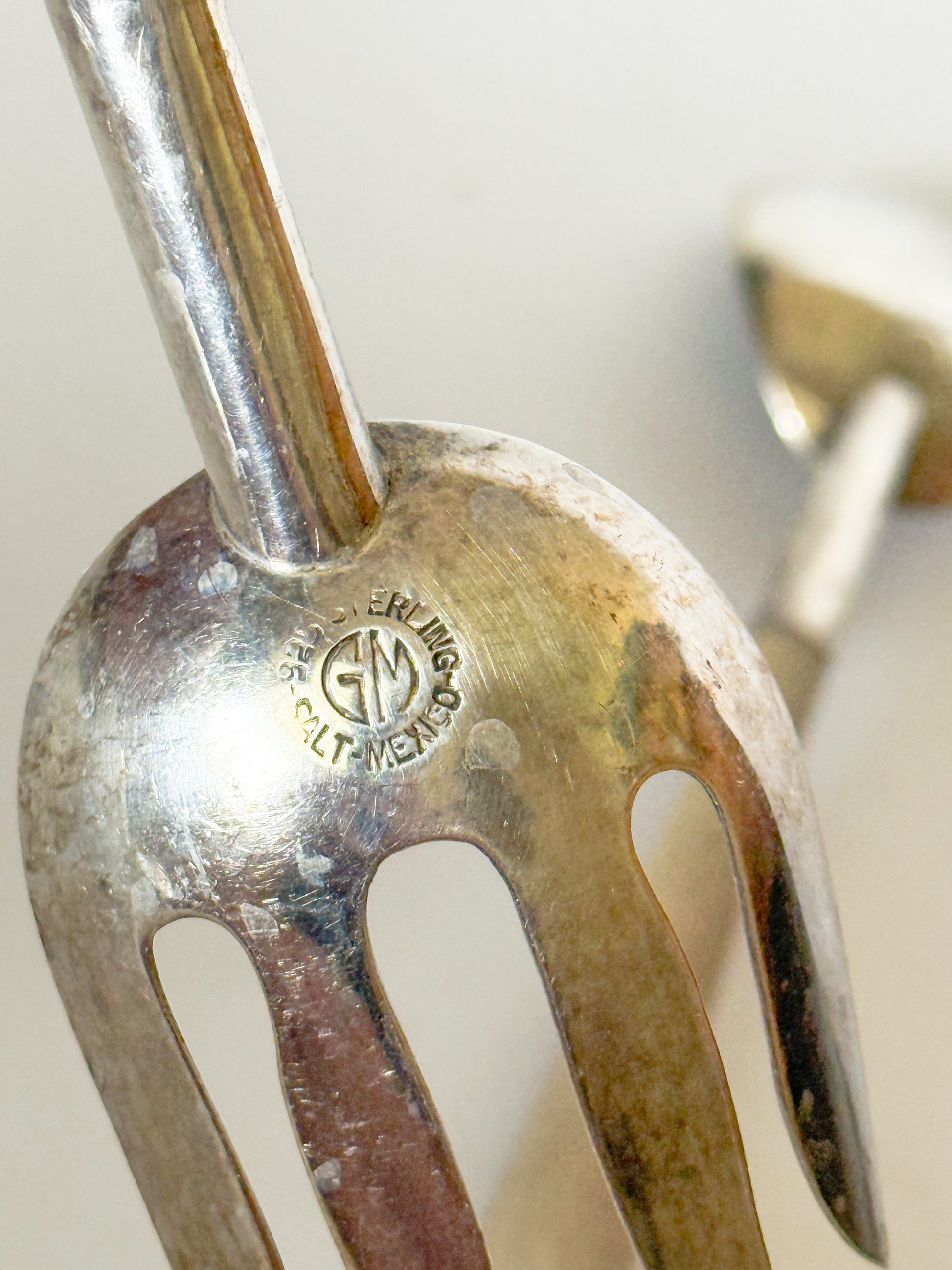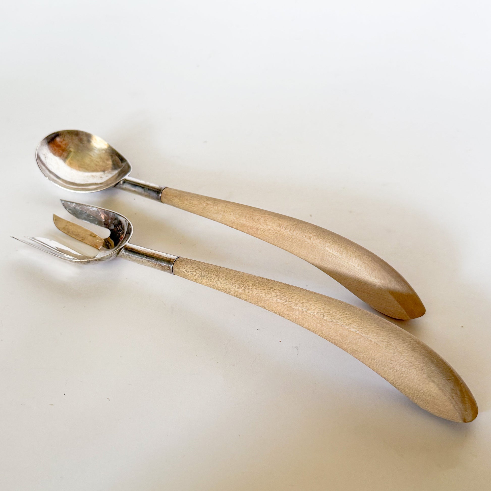 A vintage salad serving fork and spoon. Made in Mexico, this set features sterling spoon and fork tops with curved light wooden handles. Each of the pieces has simple, modern design. The underside of the spoon and fork are marked "GM 925 Sterling Salt Mexico." The GM is the mark for Gustavo Martinez, a known Mexican Silversmith.