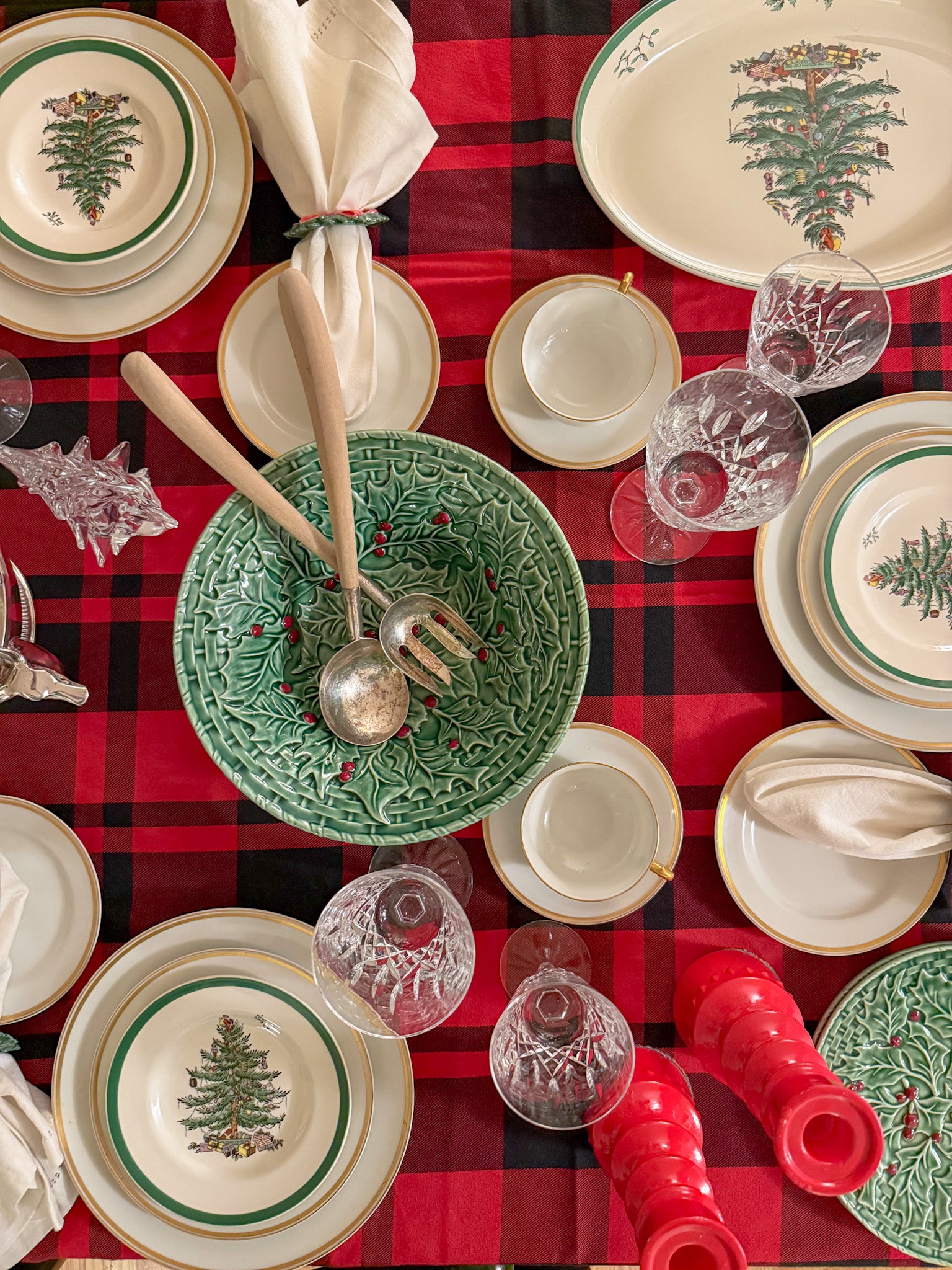The handles are a lovely light, natural wood with a natural finish. The whole look is one of understated elegance, and would pair well with a variety of china or everyday dishes.