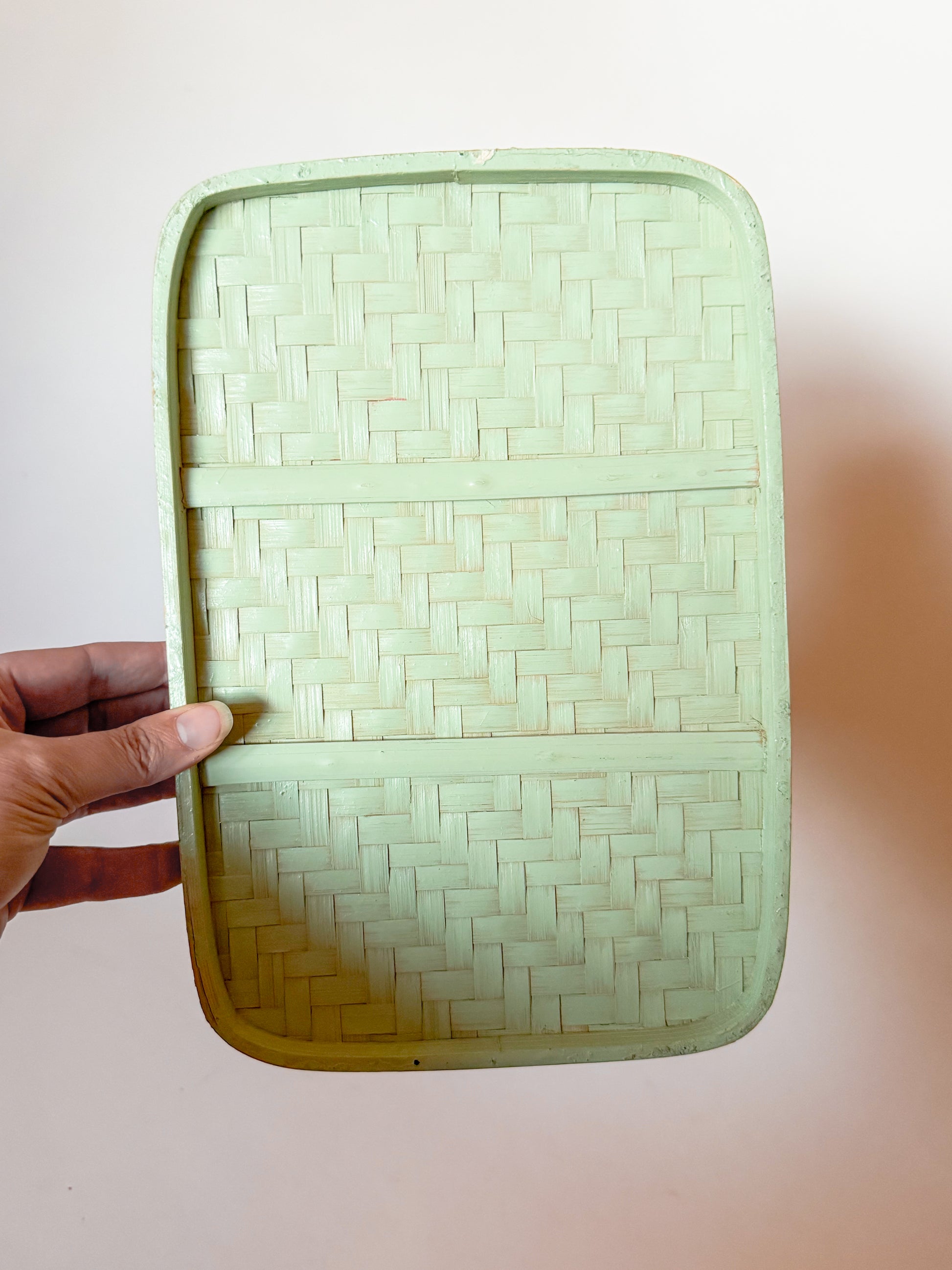 We love layering pieces around here, and this vintage painted tray is the perfect way to add a little texture and color to a styled vignette on a coffee table, nightstand, or console. Or, corral your vanity items onto it to keep your counter from appearing cluttered. It is the perfect shade of mint green.