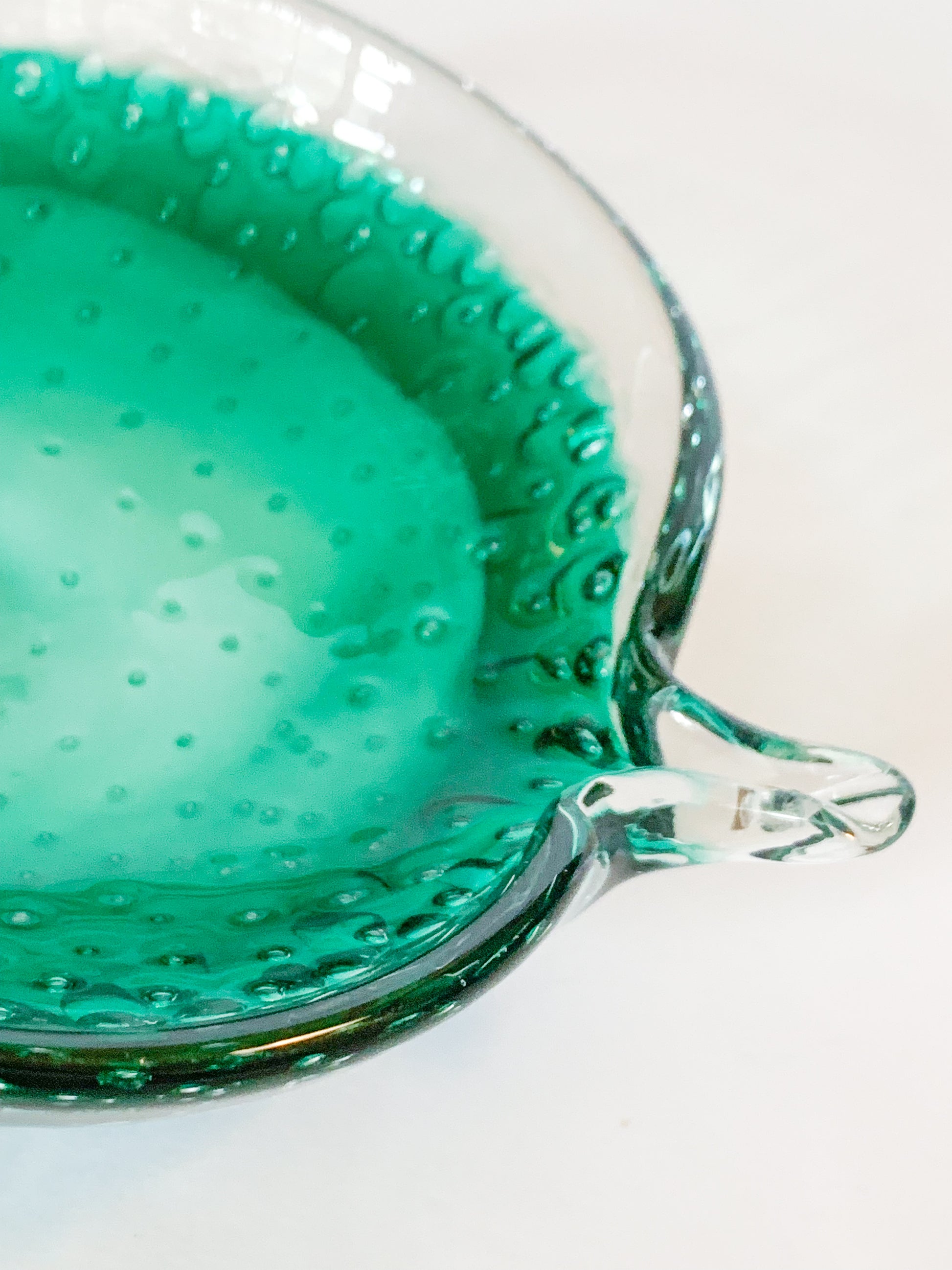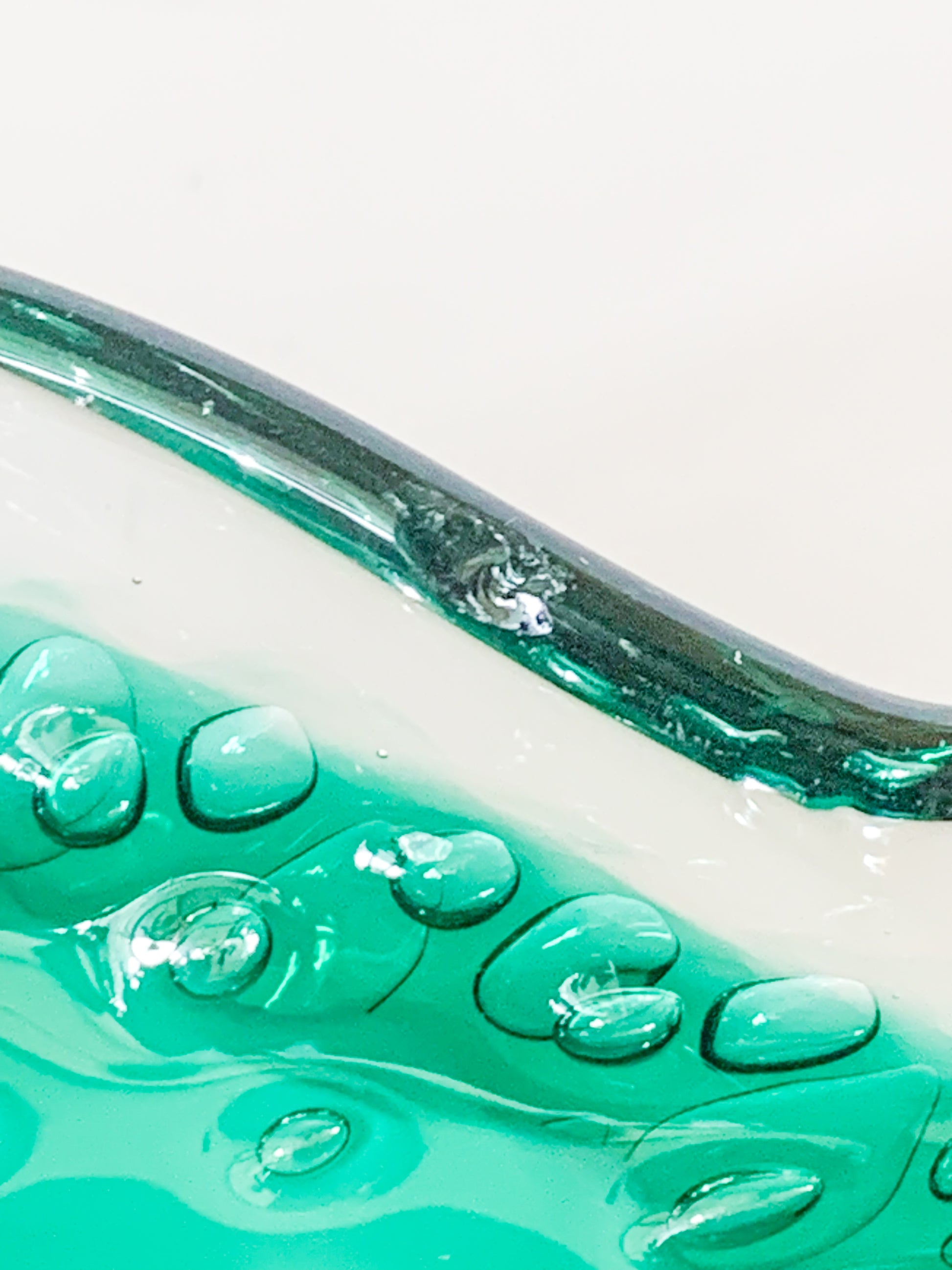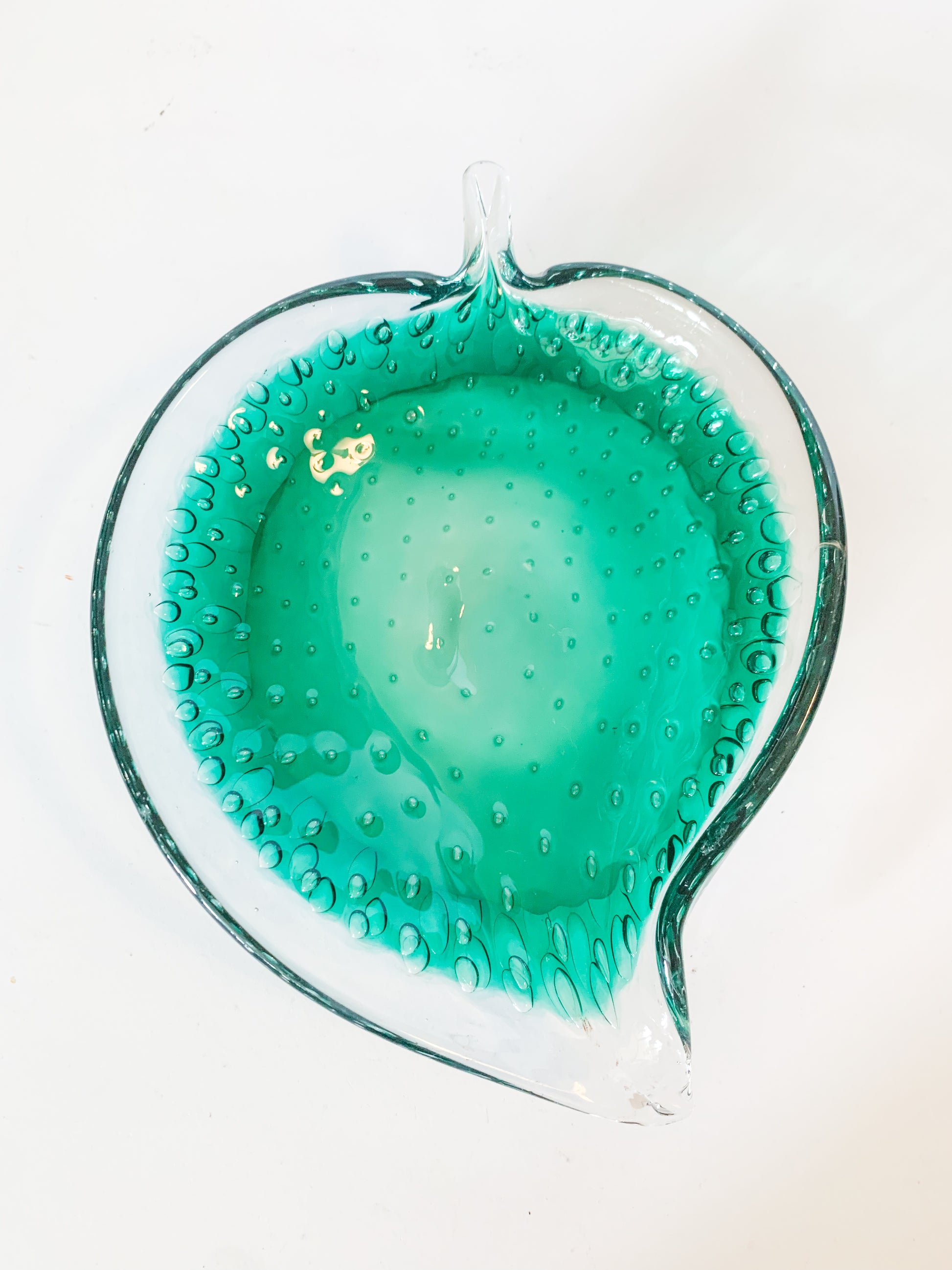 A vibrant and lovely vintage Murano hand blown glass leaf catch all dish in teal. The design has beautiful bubbles throughout, with a teal and white mixtures of colors to create a combination of translucent and opaque effects.