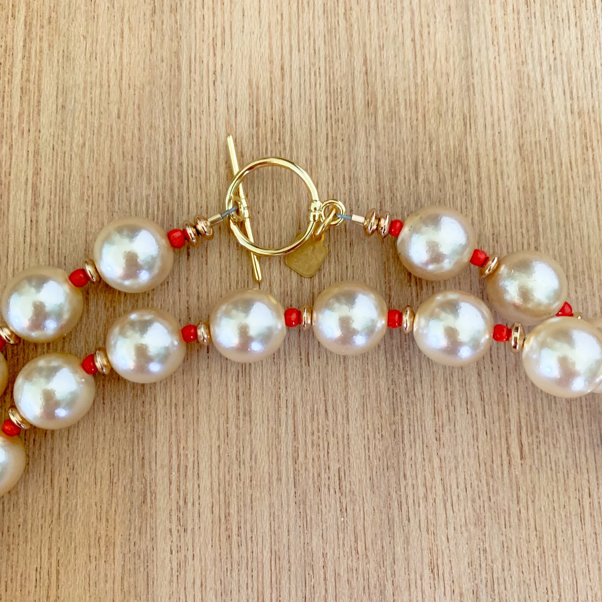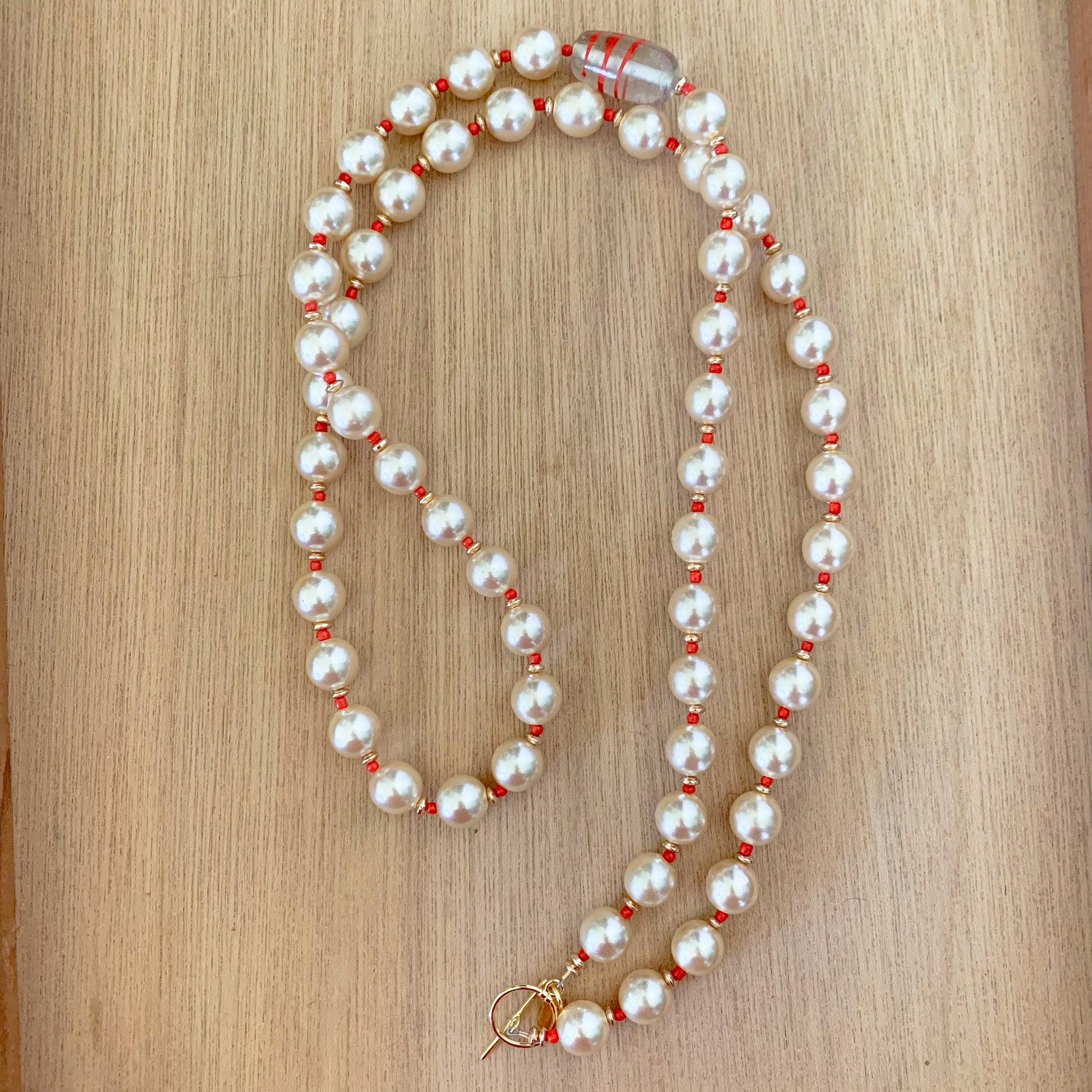 -red glass seed beads and gold spacer beads