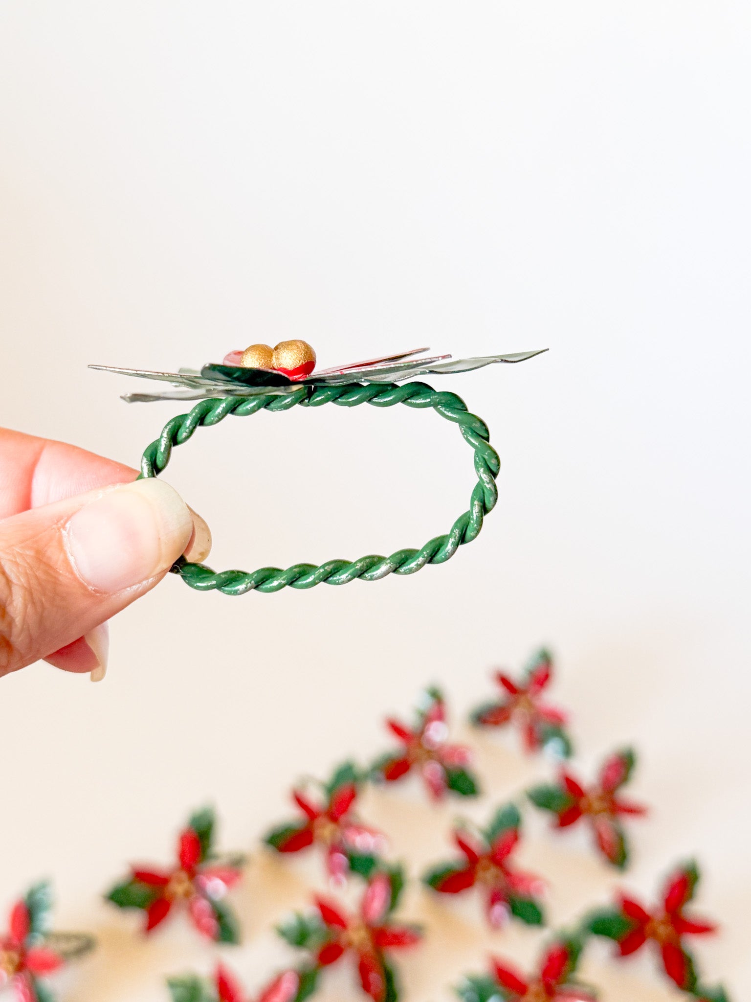 Charming large set of 16 vintage Tole style painted napkin rings with red poinsettia flowers on green foliage with a green twisted rope ring. This set is so lovely! It's rare to find such a large set. Perfect for large holiday and Christmas gatherings.